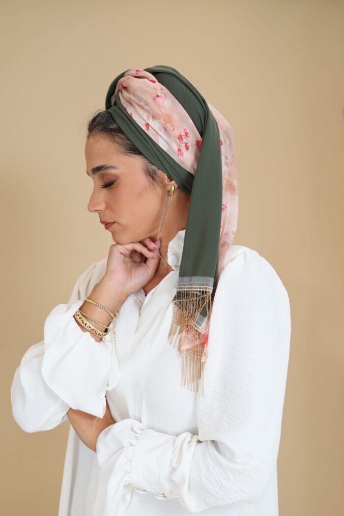 מטפחת מעוצבת דגם טליה – מעוצבת ירוק בקבוק ופרחים בשילוב פרנזים
